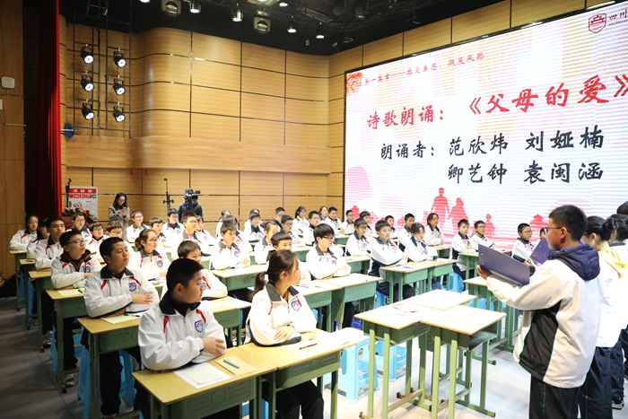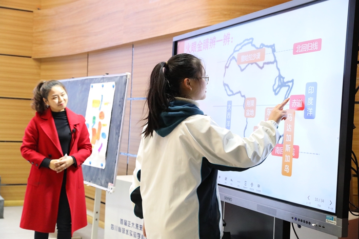 初中部精品课堂展示在多功能厅举行,优秀班主任舒卿以《感恩父母》为题执教主题班会。她高效运用网络资源、动画、抖音等多媒体,创设情境,激发学生感恩之心,教师情绪饱满,语言精练,课堂气氛活跃,学生发言踊跃,体现了“五育融合”的教育理念,德育主任甘小银作精彩点评。优秀教师刘贵容执教英语《Theweatherisfineallyearround》,融通国内外时事,注重新媒体运用,注重阅读训练,展现出深厚的学术修养和高超的教学技艺。黄媛老师执教地理《撒哈拉以南的非洲》,采用新媒体技术,以游学方式,将枯燥的知识变为直观的人文自然景观,辅以拼图游戏熟悉地理位置,通过展示自然环境和社会环境,加强疾病预防、节约粮食、反对战争等德育教育,突出本届年会主题,得到了广安市名师范凤媛的高度评价。
