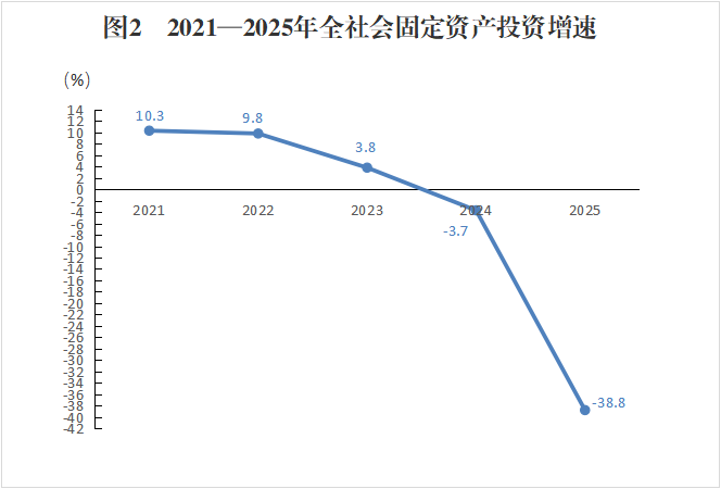2025年,全社会固定资产投资下降38.8%。分产业看,第一产业投资下降22.4%,第二产业投资下降41.3%,第三产业投资下降40.4%。其中民间投资下降56.2%,工业投资下降41.3%,技改投资下降20.6%。全年房地产开发投资下降76.8%。商品房施工面积71.8万平方米,下降24.8%;商品房销售面积40.5万平方米,增长4.7%。