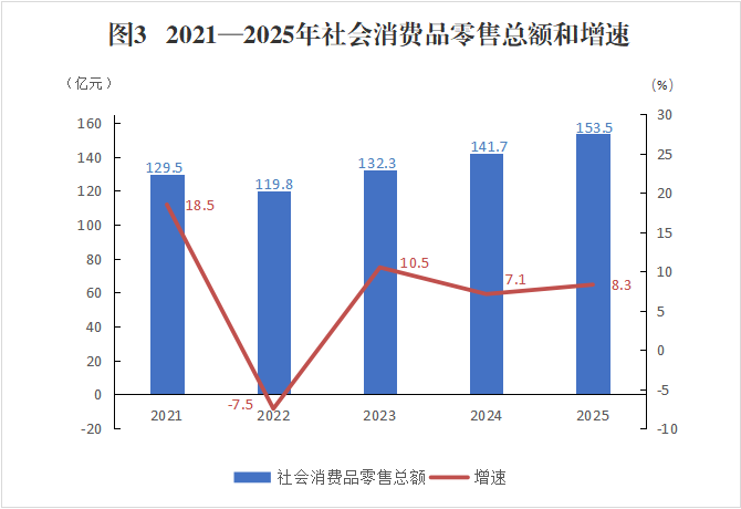 2025年,全社会消费品零售总额153.5亿元,增长8.3%。按经营地分,城镇消费品零售额115.8亿元,增长8.3%;乡村消费品零售额37.7亿元,增长8.2%。按行业分,批发业33.7亿元,增长8.1%;零售业97.3亿元,增长8.3%;住宿业3.6亿元,增长8.2%;餐饮业18.9亿元,增长8.4%。限额以上商贸企业全年通过互联网实现的商品零售额0.4亿元,增长11.1%。