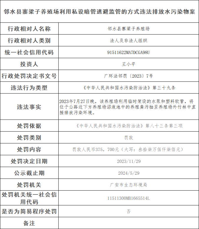 生态环境行政处罚信息公示(邻水县寨梁子养殖场)