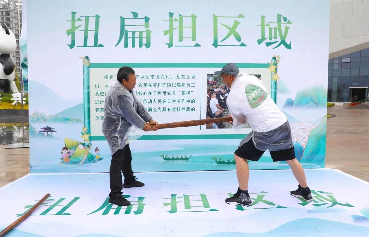 活动在欢快的歌舞《阳光路上》拉开帷幕,随后,两地文艺工作者登台展演,川渝绝活——川剧《变脸》、舞蹈《渔光曲》、四川盘子《风波带来喜酒喝》、歌舞《心动渝北》等精彩节目轮番上演,展现了非遗文化的独特魅力和美轮美奂的巴蜀风情。紧接着,备受村民期待的欢乐农家大赛正式上演,在民俗互动比赛场地,充满乡村风味的“扭扁担”项目正在进行。参赛选手在裁判的引导下相向而站,双脚前后站立,双手紧握住扁担。裁判发令后,选手们开始向不同的方向用力,直到扁担从手中脱落或手心里旋转或被对方旋转90度均告失利。投壶场地,选手们站在1米线开外,手执10只“箭”,屏气凝神对着“壶”进行投射;钓粽子区域,大家手持钓竿,争分夺秒。现场热闹非凡、处处欢声笑语。