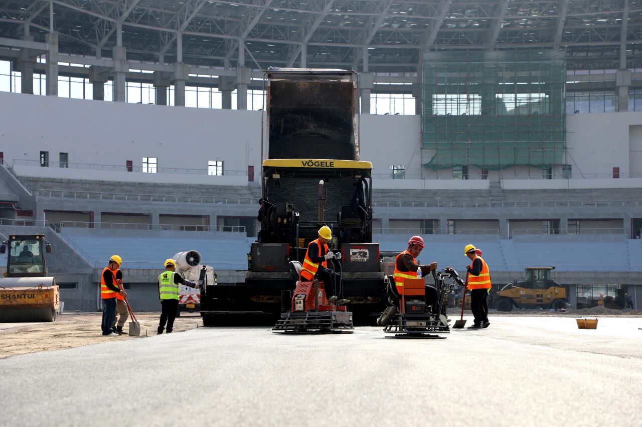 走进2号体育场主场馆,眼前一片忙碌:摊铺机正把滚烫的沥青一点点铺开,压路机跟在后面来回压实。不远处的看台上,打磨机嗡嗡作响,工人们蹲在地上,一寸一寸地磨着水泥面——这里将来要装10546个座椅。 “工期紧,我们实行三班倒,24小时不间断。”项目经理田署林站在已初具雏形的场馆前,语气坚定而有力。目前,这座占地225亩、总建筑面积超过11万平方米的奥体中心,主体结构已巍然矗立,正全力推进幕墙安装和机电调试工作,向着最后的胜利发起冲锋。 工地上辛苦,但年也没落下。除夕前夜,项目部广场上支起桌子,炖了一锅香喷喷的土鸡,大家围坐在一起吃了顿团年饭。电工沈剑峰从湖北武汉来,吃完饭给老婆打视频:“老婆,辛苦你了。等我干完这阵,回去给你带礼物!”