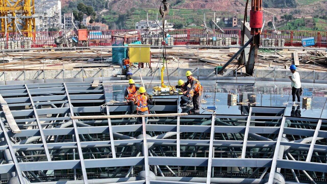 在工地上,一支10人的“尖兵班”特别打眼——他们是专门安装场馆穹顶和外立面幕墙玻璃的工人师傅。班组长付健强今年54岁,干这行快三十年了。早上天刚亮,他和工友们就系好安全绳,站上了几十米高的作业平台。 “这不仅是技术活,更是一场对体力的考验。我们平均每天要完成65块玻璃的安装,而每块玻璃平均重达300公斤,最大面积接近5平方米。”塔吊把一块块大玻璃吊上来,付师傅和工友们得在高空徒手把这些“巨无霸”稳稳地嵌进龙骨。 “往左一点……好,慢慢落!”站在穹顶龙骨上的付师傅手扶着玻璃,和工友们一点点引导着玻璃精准卡入槽位。焊花在他身侧不远处飞溅,如同为马年新春献上的礼花。在这离地几十米的高空,他们用一双双巧手,为城市的新地标“穿”上璀璨的“外衣”。 “看着玻璃在手里一块块‘上墙’,场馆慢慢变得完整,就像小时候拼图一样,看着心里舒坦,很有成就感。”趁着吊装的间隙,付师傅摘下手套,搓了搓冻红的双手。