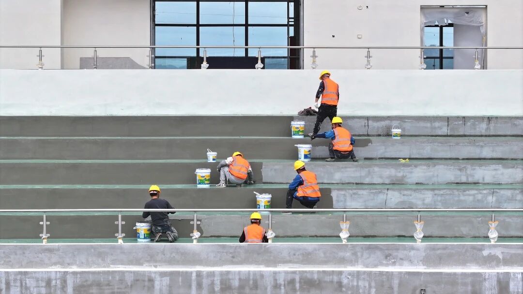 走进备受瞩目的邻水县奥体中心项目建设现场,机器轰鸣,一派热火朝天的施工景象:一号馆穹顶,工人们正在进行幕墙安装;体育馆内,看台区域的地面打磨细致入微;高空作业车频繁升降,施工人员有序进行高空作业;室外平场作业同步推进。室内外清理、喷涂、电工安装等各工序交叉作业,忙碌有序。